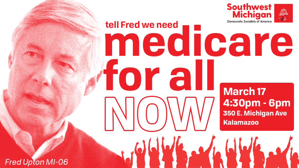 SWMI DSA are organizing rallies outside of Upton’s offices, on Wednesday March 17 in support for Medicare for All. The two rallies, from 4:30pm – 6pm, will take place at 350 E. Michigan Ave in Kalamazoo and 720 Main Street in St. Joseph.